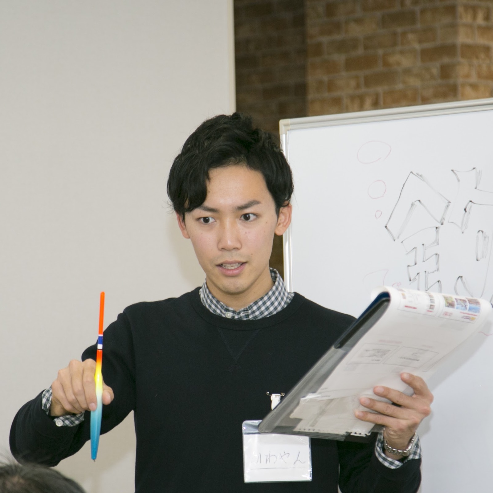 カフェ英國屋 なんば本社 のパーティールームで集合して、案内役の「かわやん」こと、釣り好きアナウンサーの川田一輝から、一日の流れや、釣りの「最初のイロハ」を教えてもらいます。